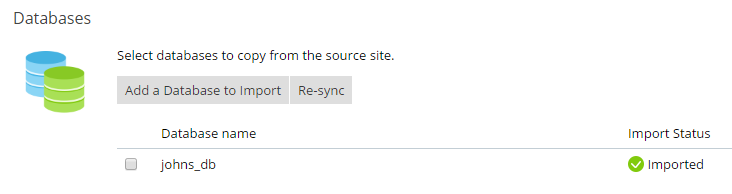 In qualsiasi momento dopo aver importato un database, puoi importarlo di nuovo selezionando la casella di controllo corrispondente e cliccando sul pulsante Re-sync. Nota che questo sovrascriverà qualsiasi modifica apportata al database o al suo contenuto sul server di destinazione.
