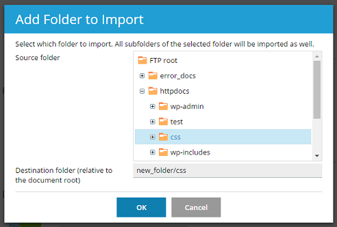 - Sotto "Files", clicca su Add Folder to Import e sfoglia la cartella che vuoi importare. Facoltativamente, puoi specificare la posizione desiderata per la cartella sul server di destinazione, relativa alla directory principale dei documenti del sito web di destinazione.