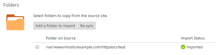 In qualsiasi momento dopo aver importato una cartella, puoi importarla di nuovo selezionando la casella di controllo corrispondente e cliccando sul pulsante Re-sync. Nota che questo sovrascriverà qualsiasi modifica che puoi aver fatto alla cartella o al suo contenuto sul server di destinazione.
