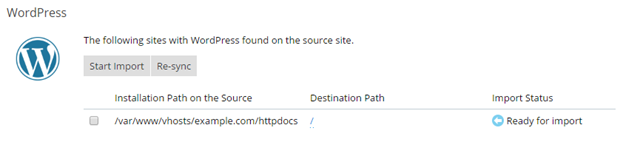 Plesk può importare un'applicazione dal sito web di origine a quello di destinazione, compresi tutti i suoi file e il database.
