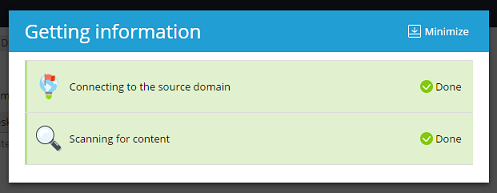 Plesk proverà a connettersi al sito web di origine e a scansionarlo per il contenuto. Se la connessione ha successo, seleziona uno o più oggetti dei seguenti tipi da importare: