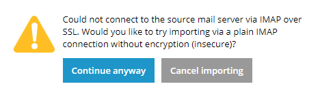 Plesk cercherà di connettersi al server di origine tramite IMAP su SSL. Se il server di posta di origine non supporta le connessioni crittografate tramite IMAP o è protetto con un certificato SSL/TLS autofirmato o non valido, Plesk ti chiederà il permesso di importare la posta su una connessione non sicura: